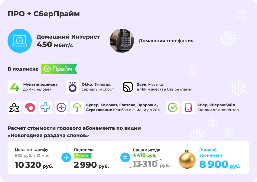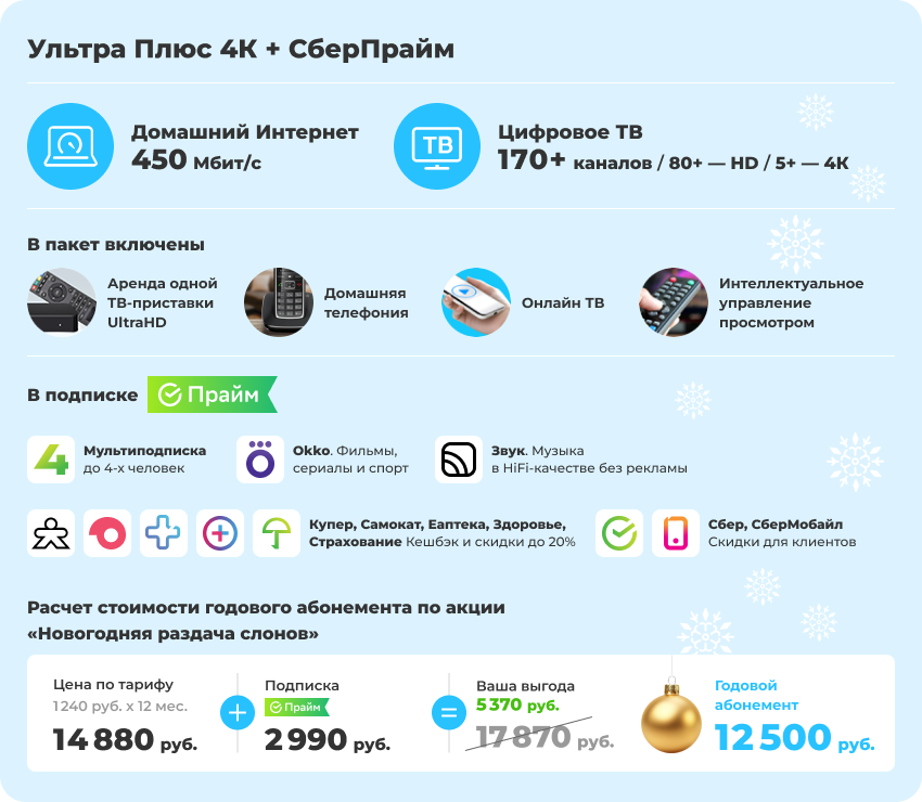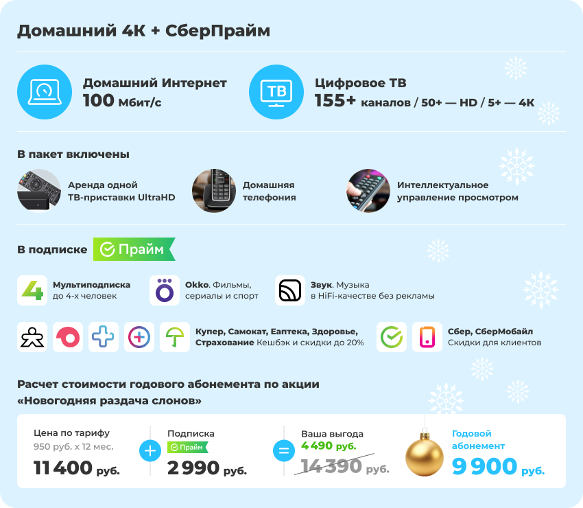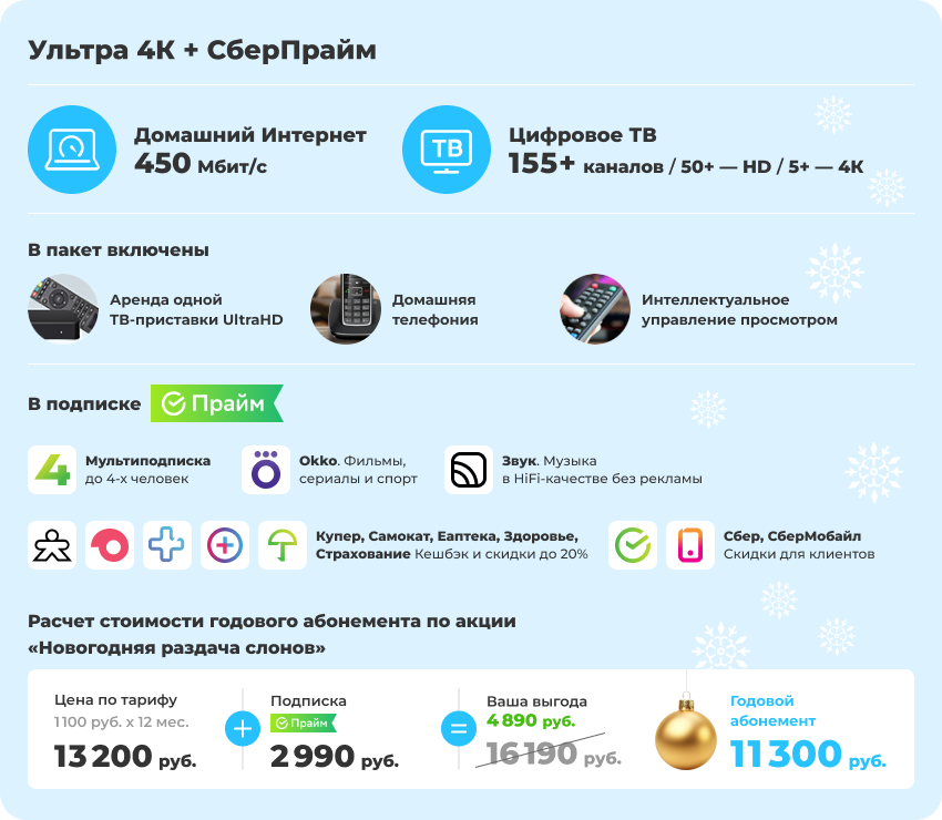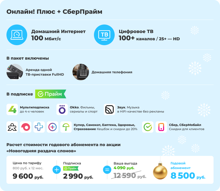 Ниже вы найдете детальное описание продуктов, которые участвуют в нашей традиционной акции «Новогодняя раздача слонов», здесь есть не только Интернет и ТВ, но и привилегии в подписке СберПрайм для тех, кто любит кино и музыку, часто покупает онлайн и регулярно переводит деньги. То есть для нас с вами! Весь год без забот!
